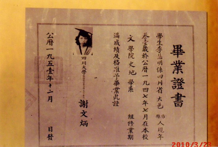 学生李惠明系四川省大邑县人,现年31岁,于公历1947年7月在本校文学院史地学系组修业期满,成绩及格,准予毕业。