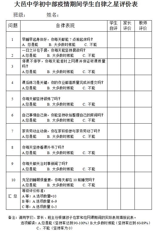 本次活动由各班班主任结合学生在特殊时期克服特殊困难的表现,分学生自评、家长评价、教师评价综合评出“停课不停学 宅家我自律”的“自律之星”。