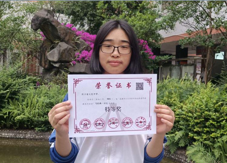 来自高2018级3班刘庆同学的诗文作品《川蜀诗韵,诗酒人生》荣获特等奖。