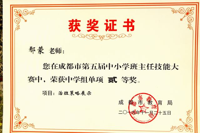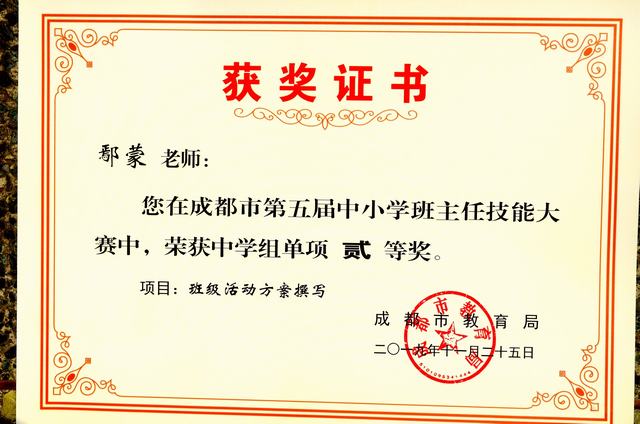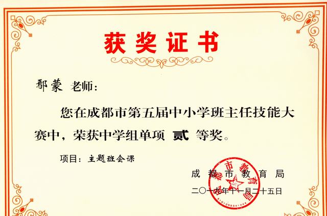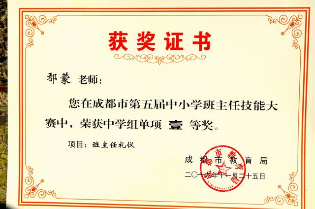 我校教师鄢蒙在成都市第五届中小学班主任技能大赛中荣获优异成绩
