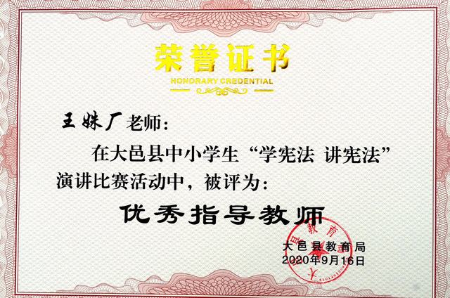我校教师王姝厂在2020年县“学宪法 讲宪法”演讲比赛活动中被评为优秀指导教师