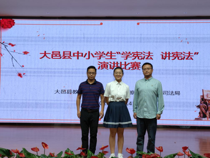 9月14日下午,王怡平同学代表学校参加了大邑县学宪法・讲宪法演讲比赛。在演讲过程中,王怡平同学大方、沉稳,娓娓道来又慷概激昂,获得了评委的一致好评,取得全场最高分。