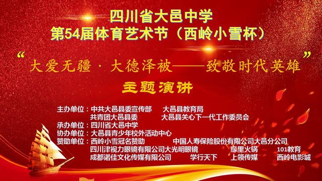 为了全面深入贯彻党的教育方针,落实落细立德树人的根本任务,结合我校三自德育课程“大爱无疆”“大德泽被”,弘扬新时代英雄的大爱大德的奉献精神,营造学习榜样的良好校园氛围,培养学生的家国情怀与责任担当,四川省大邑中学于11月22日,特举行第54届体育艺术节演讲比赛。