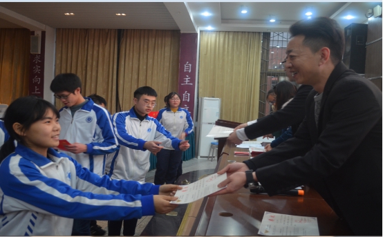随着颁奖音乐的响起,高一、高二、高三的唐仲英爱心奖学金获得者走上领奖台,分别从校领导手中接过获奖证书。