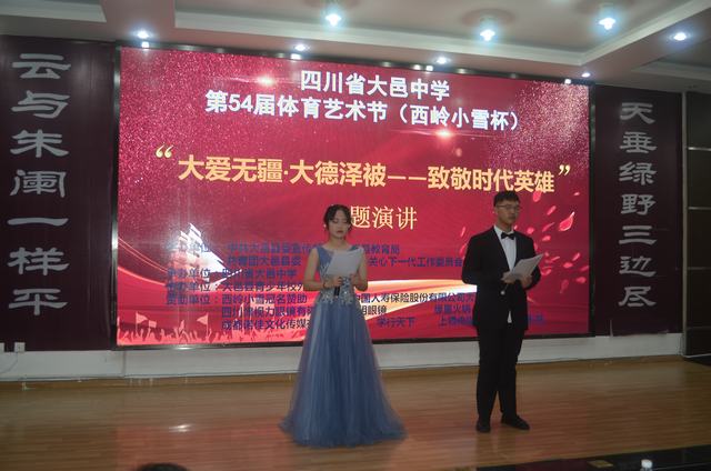 为了全面深入贯彻党的教育方针,落实落细立德树人的根本任务,结合我校三自德育课程“大爱无疆”“大德泽被”,弘扬新时代英雄的大爱大德的奉献精神,营造学习榜样的良好校园氛围,培养学生的家国情怀与责任担当,四川省大邑中学于举行第54届体育艺术节演讲比赛。
