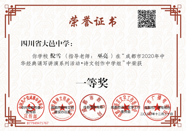 我校学生在“成都市2020年中华经典诵写讲演系列活动—写经典中学组”中获奖