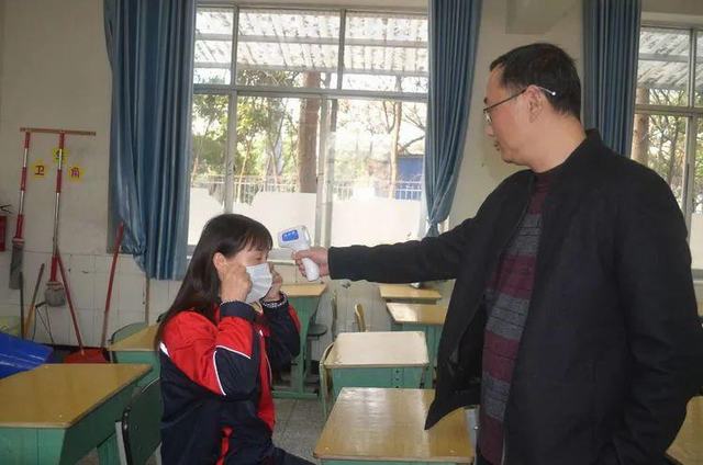 学生已到达教室门口,在教室外间隔1米有序排队接受班主任体温测量,班主任对学生进行晨检并登记,检测完毕且无异常的学生有序进入教室落座。