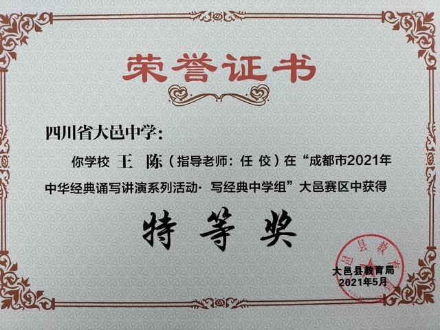 我校学生在“成都市2021年中华经典诵写讲演系列活动—写经典中学组”大邑赛区中荣获特等奖