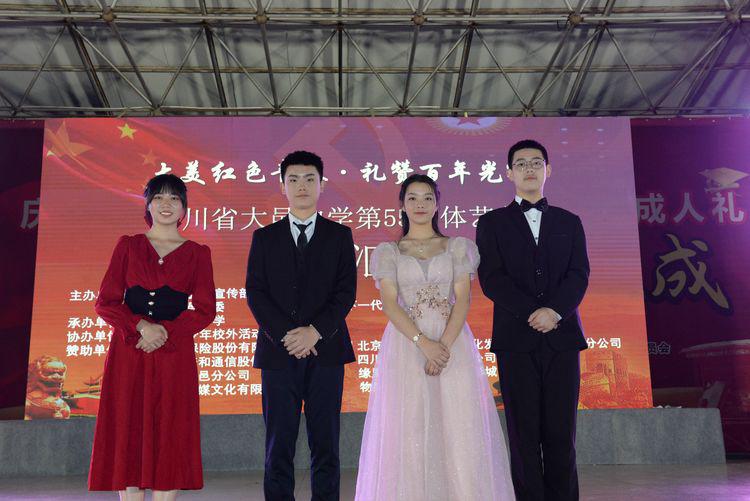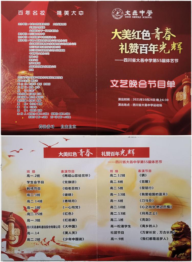 为了全面深入贯彻党的教育方针,落实落细立德树人的根本任务,结合我校三自德育课程“大美慧心”,以美育人,以美化人,大力推行书香校园之美、强健体魄之美、艺术灵动之美,10月26日晚,四川省大邑中学隆重举行了以“大美红色青春 礼赞百年光辉”为主题的第55届体艺节文艺晚会。