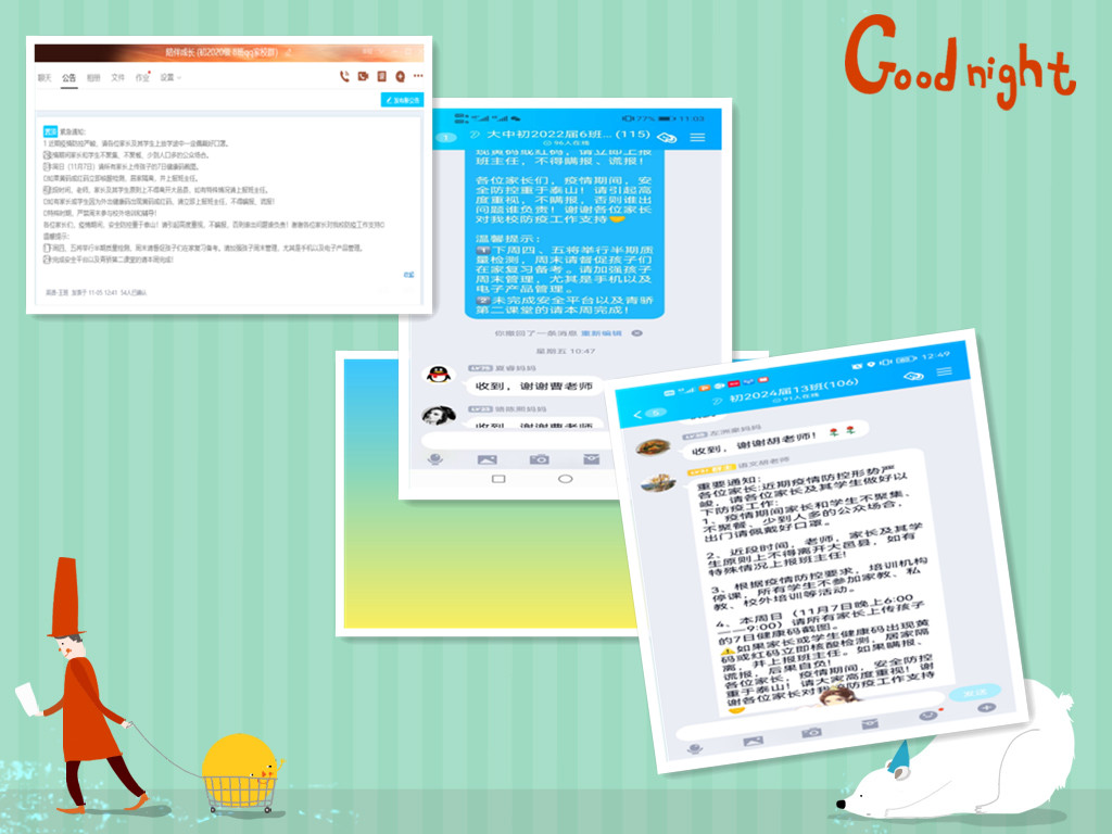 4、加强疫情防控宣传教育,利用网络和告家长书等宣传途径多层次、多角度宣传引导家长、学生自觉遵守测温、扫码、戴口罩等防控规定。