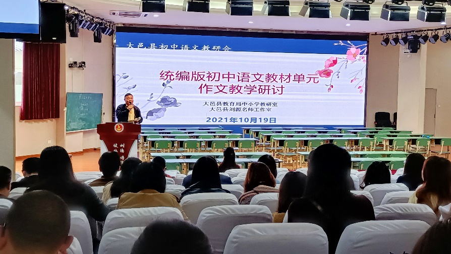 “双减”背景下,为切实提升课堂教学质量,各学校、各学科均积极转变观念,探索教学方式与教学策略的新路径。那么,语文教学尤其是最难的作文教学,又该如何转变呢?10月19日,大邑县刘源名师工作室、大邑县中学语文教研室在实验中学举行主题为“统编版初中语文单元同步作文教学”的联合研讨会。大邑县刘源名师工作室全体成员、全县七、八年级语文教师参加本次研讨会。