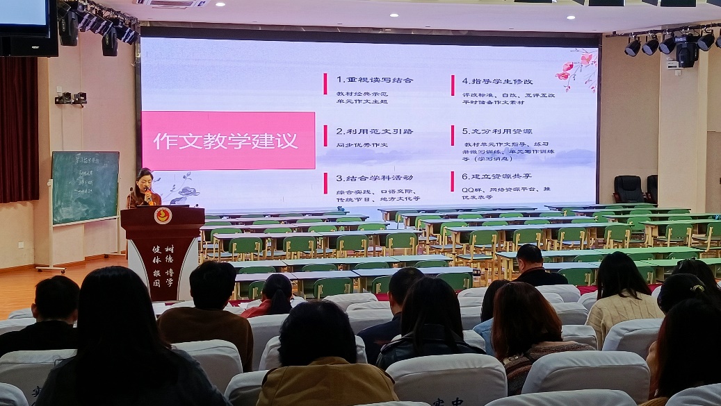 大邑县中学语文教研室语文教研员付晋作总结点评。她从六个方面向全体语文教师提出作文教学建议:重视读写结合、利用范文引路、结合学科活动、指导学生修改、充分利用资源、建立资源共享。同时,她希望教师们积极参与小专题研究成果交流和语文教学工作经验交流,期待通过经验交流,能快速地促进教师专业成长,提高县域语文教学水平。