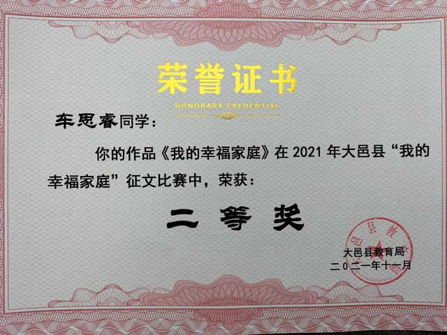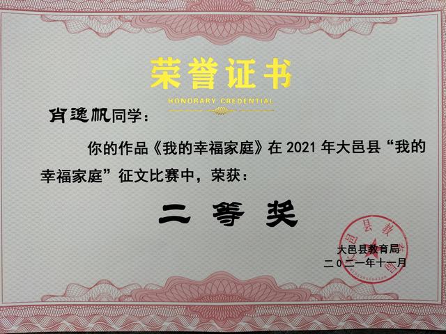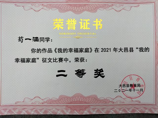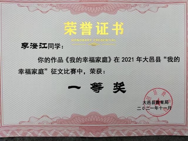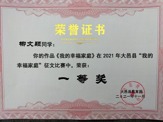 我校学生在2021年大邑县“我的幸福家庭”征文比赛中获奖