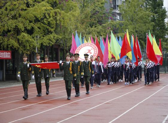 彩旗飘飘,青春飞扬。国旗队,会徽队,彩旗队昂首阔步而来。随着五星红旗冉冉升起,师生齐唱国歌,同学们精神抖擞、势如破竹。