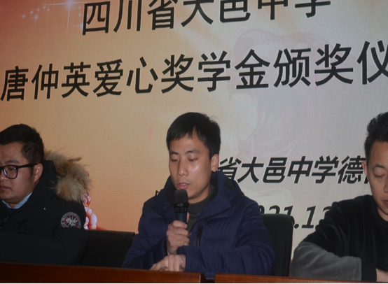 为弘扬唐仲英基金会“服务社会、奉献爱心、推己及人、薪火相传”的宗旨,发挥示范引领的榜样作用,让更多的人加入到奉献爱心的行列。2021年12月30日下午,我校在阶梯教室举行了2021年唐仲英爱心奖学金颁奖仪式。德育处副主任曾强、团委书记毛程杰、德育处吴凡老师以及学校爱心辅导员范英老师出席了颁奖仪式。