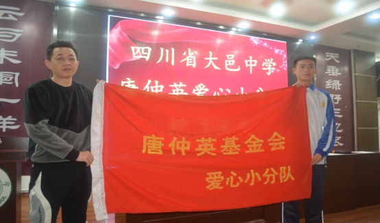 接着,由团委书记毛程杰老师为大邑中学唐仲英爱心小分队授旗,爱心小分队队长在毛老师的手中光荣的接到了小分队队旗。