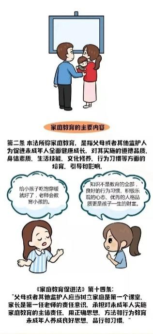 自2022年1月1日起,《中华人民共和国家庭教育促进法》的正式实施意味着家庭教育从传统意义上的“家事”上升为有法可依的“国事”,中国父母正式进入“依法带娃”时代。要守法先知法,家庭教育法中有哪些主要内容呢?让我们跟着下面的图解一起去看看吧。