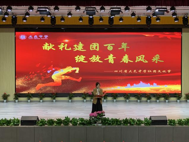 大邑中学初中部副校长曹宇为活动致辞。她强调开展社团活动在学校文化建设中的重要作用,希望同学们通过参与活动,实现自我教育、自我管理和自我创新,在社团自治自理、健康发展的过程中增强学生的核心素养。