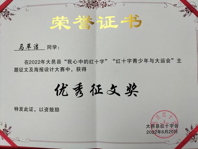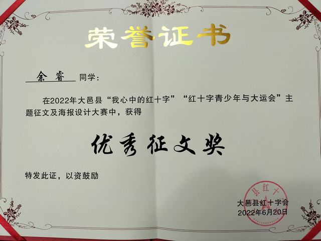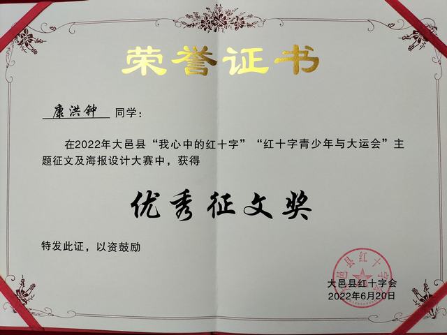 我校学生在2022年“我心中的红十字”“红十字青少年与大运会”主题征文大赛中荣获优秀征文奖