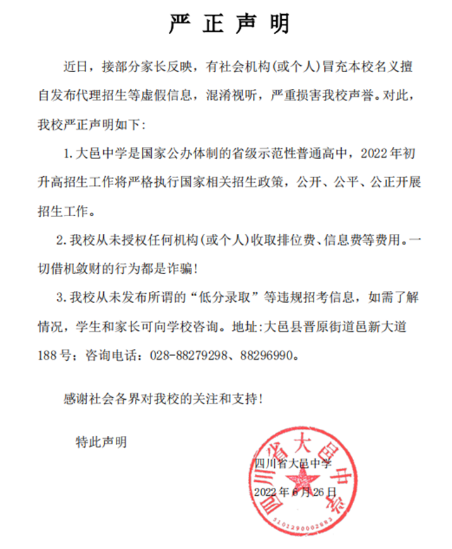 近日,接部分家长反映,有社会机构(或个人)冒充本校名义擅自发布代理招生等虚假信息,混淆视听,严重损害我校声誉。对此,我校严正声明如下: