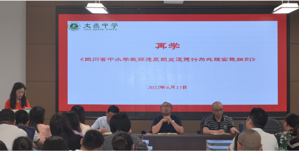 会上,初中部办公室副主任严文娟带领全体教师再学《四川省中小学教师违反职业道德行为处理实施细则》。她重点解读了《细则》第二章违反职业道德的行为、第五章处理结果使用、第六章监督与问责。同时组织全体教师学习违规违纪反面案例,引导教师自觉遵守师德行为准则加强警示教育,以天府新区教师违规补课处罚为戒,举一反三,强化教师红线意识、底线意识。