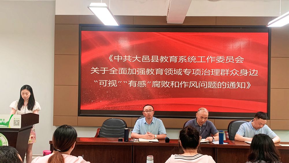 会上,大邑中学初中部办公室副主任严文娟组织全体教师学习《关于开展教育领域专项治理群众身边“可视”“有感”腐败和作风问题的工作方案》和《中共大邑县教育系统工作委员会关于全面加强教育领域专项治理群众身边 “可视”“有感”腐败和作风问题的通知》文件精神。大邑中学副校长、初中部负责人王波要求全体教师提高思想认识,加强师德师风学习,不踩红线,不逾底线:严禁有偿违规补课;严禁违规征订教辅;严禁在教育教学管理、实施教育惩戒过程中有不当行为;严禁向学生推销图书报刊;严禁到校外培训机构兼职任教,为校外培训机构和他人有偿介绍生源等。