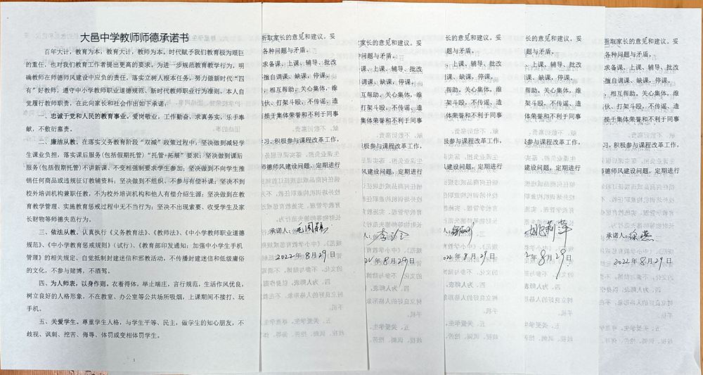 通过培训,全体教师明确了在师德师风建设中的应负的责任,并签订了《大邑中学教师师德承诺书》。 筑牢师德底线,树立高尚师风。全体教师时刻牢记身份,自觉修身律己,以高尚的师德感染人、影响人,为办好新时代人民满意的教育贡献自己的一切力量! 图文:高云浩 审核:严文娟