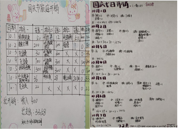九年级同学则成为了家庭的财务担当,计划安排国庆期间家庭的一周开销,做一个合格的规划师,感受父母挣钱的不易。