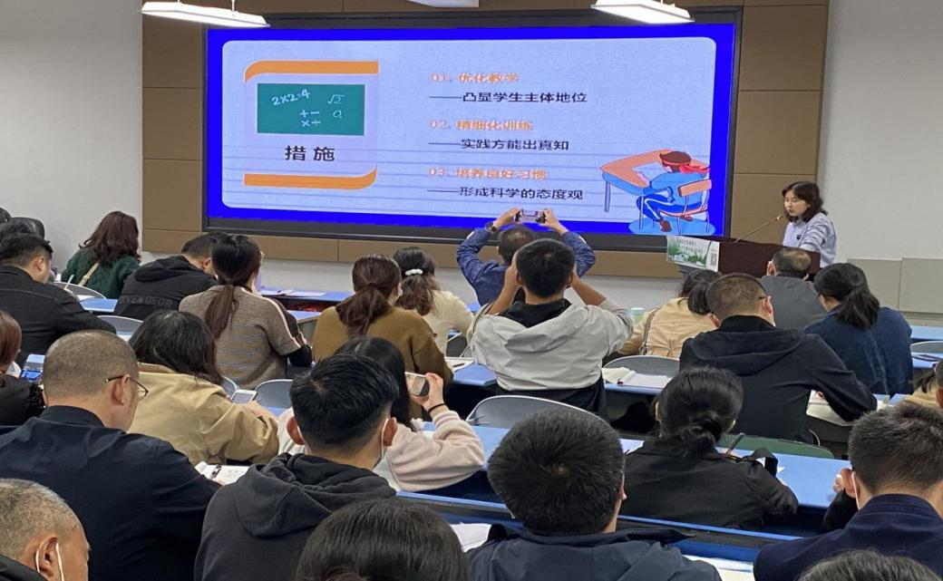 杨成军分享《信息技术在数学课堂教学中深度融合的理解和实践》,杨老师以形象的比喻、诙谐的语言,把看似高深的信息技术浅显地展现在老师们面前,让在场教师顿时有了建设“技术赋能,高效融合”新课堂的信心。