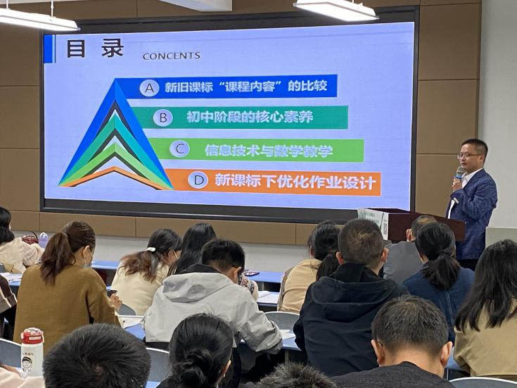 赵敏组织大家学习2022版新课标。赵老师从新旧课标课程内容的比较、初中阶段的核心素养、信息技术与数学教学、新课标下优化作业设计四个方面进行分享交流,让与会教师受益匪浅。