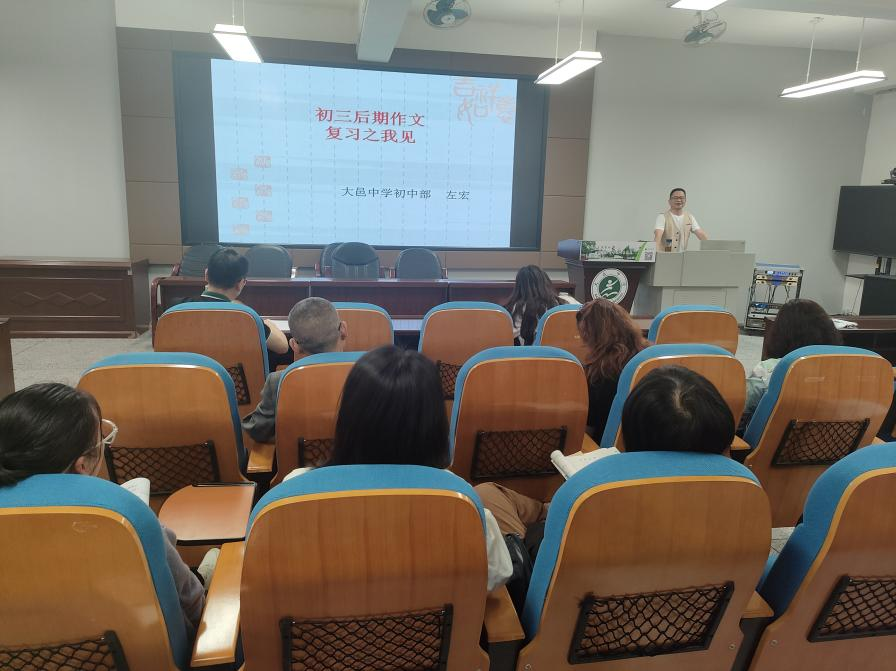 活动三:专题讲座,谋求实效 我校教师左宏分享了主题为《初三后期作文复习》的专题讲座。他以平实的语言深入浅出地对作文课的复习进行解读,对近年来我县中考作文得分情况的和考查内容进行分析,提出作文复习教学的建议。