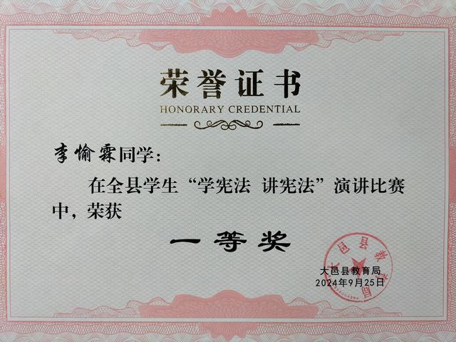 我校学生李愉霖在大邑县“学宪法 讲宪法”演讲比赛中,荣获一等奖