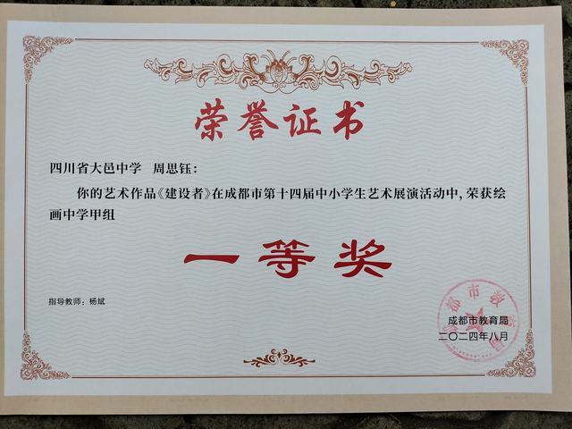 我校学生周思钰在成都市第14届中小学生艺术展演活动中荣获绘画中学甲组一等奖