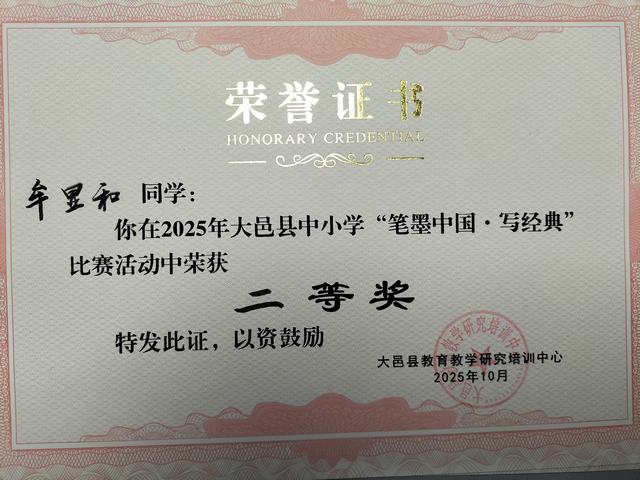 我校学生牟显和在2025年大邑县中小学“笔墨中国·写经典”比赛活动中荣获二等奖