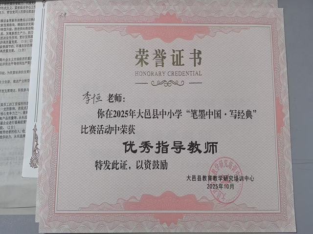 我校教师李恒在2025年大邑县中小学“笔墨中国·写经典”比赛活动中荣获优秀指导教师