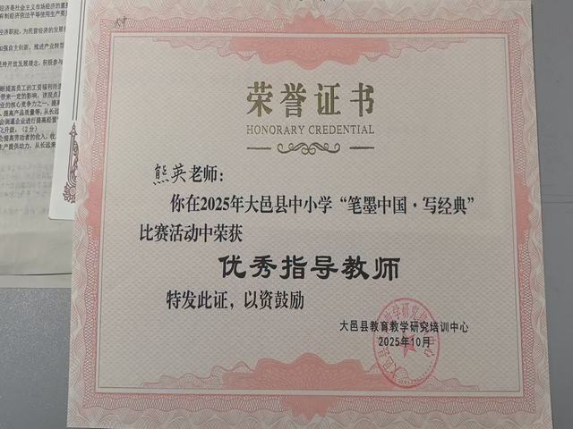 我校教师熊英在2025年大邑县中小学“笔墨中国·写经典”比赛活动中荣获优秀指导教师