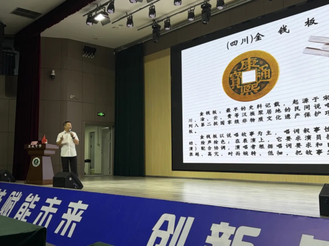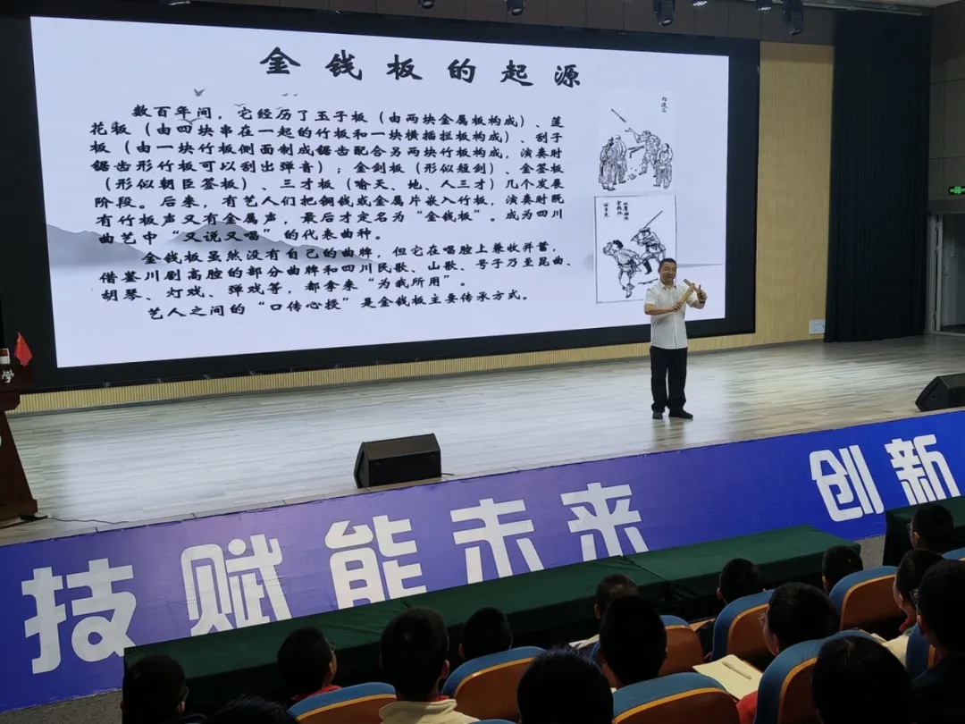 “竹韵金声,叩响巴蜀千年故事。”为进一步弘扬中华优秀非遗传统文化,传承民族雅韵,丰富校园生活,10月21日,“美育天府·百名艺术家美育浸润行动”走进我校。成都市非物质文化遗产保护中心曲艺团二级演员、成都市曲艺家协会副主席、“金钱板”传人谢赤非老师,引领同学们走进非遗曲艺的殿堂,感受传统艺术的独特魅力。