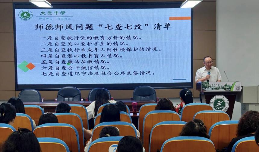 大邑中学副校长王波围绕《师德师风问题“七查七改”清单》进行了深入讲解和部署。他逐条解读了清单内容,引导全体教师对照学习内容,进行自我审视、深度剖析、明确方向。他强调,每一位教师都要以清单为镜,时常检视自身,将师德师风要求内化于心、外化于行,实现自我净化、自我完善、自我革新、自我提高。