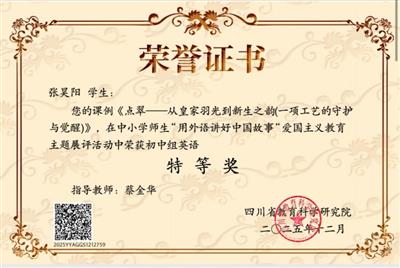 2026-01-23为落实立德树人根本任务,厚植家国情怀,拓展国际视野,我校英语组教师蔡金华、古红梅、赵稷苗、周娟积极指导学生参加省、市“用外语讲好中国故事”主题展示活动,取得突出成绩:斩获四川省特等奖及多项成都市特等奖、一、二等奖。其中,张昊阳同学以英文演讲《点翠——从皇家羽光到新生之韵》在省市两级比赛中均荣获特...阅读 - 222026-01