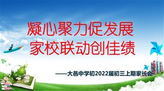 2021-10-25——大邑中学初2022届家长会纪实银霜初降征途明,家校携手再出发。为进一步加强家校联系,增进家长对当前“双减”教育形势、学校“五项管理”等工作的了解,让家长及时转变家庭教育理念,达到家校共育、助力学生成长的目的,10月22日,大邑中学初2022届成功召开“凝心聚力促发展家校联动创佳绩”的主题家长会。未雨绸缪...阅读 - 19 2021.10
