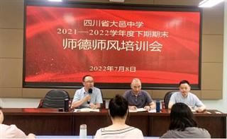 2022-07-147月13日下午,大邑中学2021-2022学年下期期末教师会在阶梯教室召开,全体教师参加了会议。严守师德风清气正会议首先进行了师德师风专题学习。副校长刘进军组织学习了《新时代教师职业行为十项准则》、《中小学教师职业道德规范》、《四川省中小学教师违反职业道德行为处理实施细则》、《成都市中小学(幼儿园)教师职业...阅读 - 09 2022.07