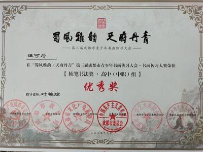 我校学生汪可为在“蜀风雅韵·天府丹青”第三届成都市青少年书画传习大会·书画传习大赛荣获软笔书法类·高中组优秀奖