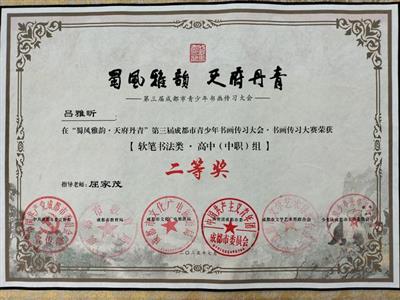 我校学生吕雅昕在“蜀风雅韵·天府丹青”第三届成都市青少年书画传习大会·书画传习大赛荣获软笔书法类·高中组二等奖